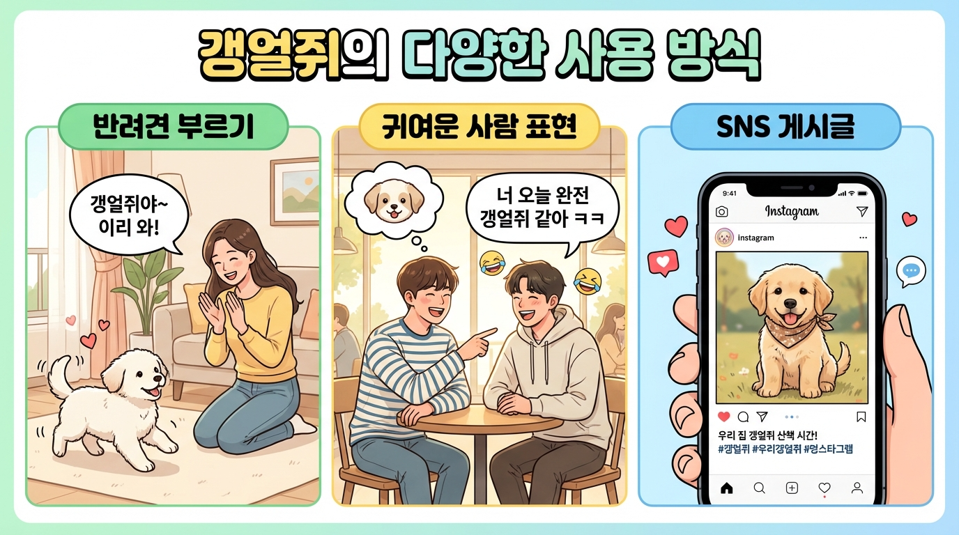 갱얼쥐는 2020년대 초중반부터 인스타그램, 유튜브, 틱톡 같은 SNS에서 널리 퍼지기 시작했어요. 특히 반려견을 키우는 사람들이 자신의 강아지를 소개할 때 이 표현을 자주 사용했고, 시간이 지나면서 일반인들도 자연스럽게 쓰게 된 거죠. 요즘 10대와 20대 사이에서는 더 이상 신조어가 아닌 일상용어처럼 쓰이고 있어요. 제 아이 친구들도 자기 개를 소개할 때 이렇게 부르더라고요.