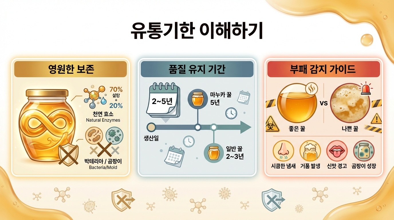 꿀에는 자연 방부제 역할을 하는 효소 성분이 포함돼 있어서 장기간 보관해도 세균이나 곰팡이가 번식할 수 없어요. 다만 포장되어 판매되는 꿀 중 일부는 품질 유지를 위해 유통기한을 2~5년으로 표시하는 경우가 있어요.