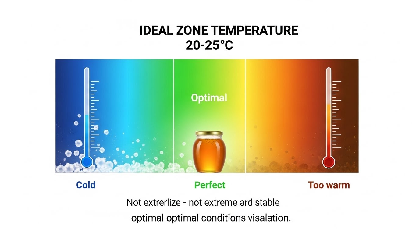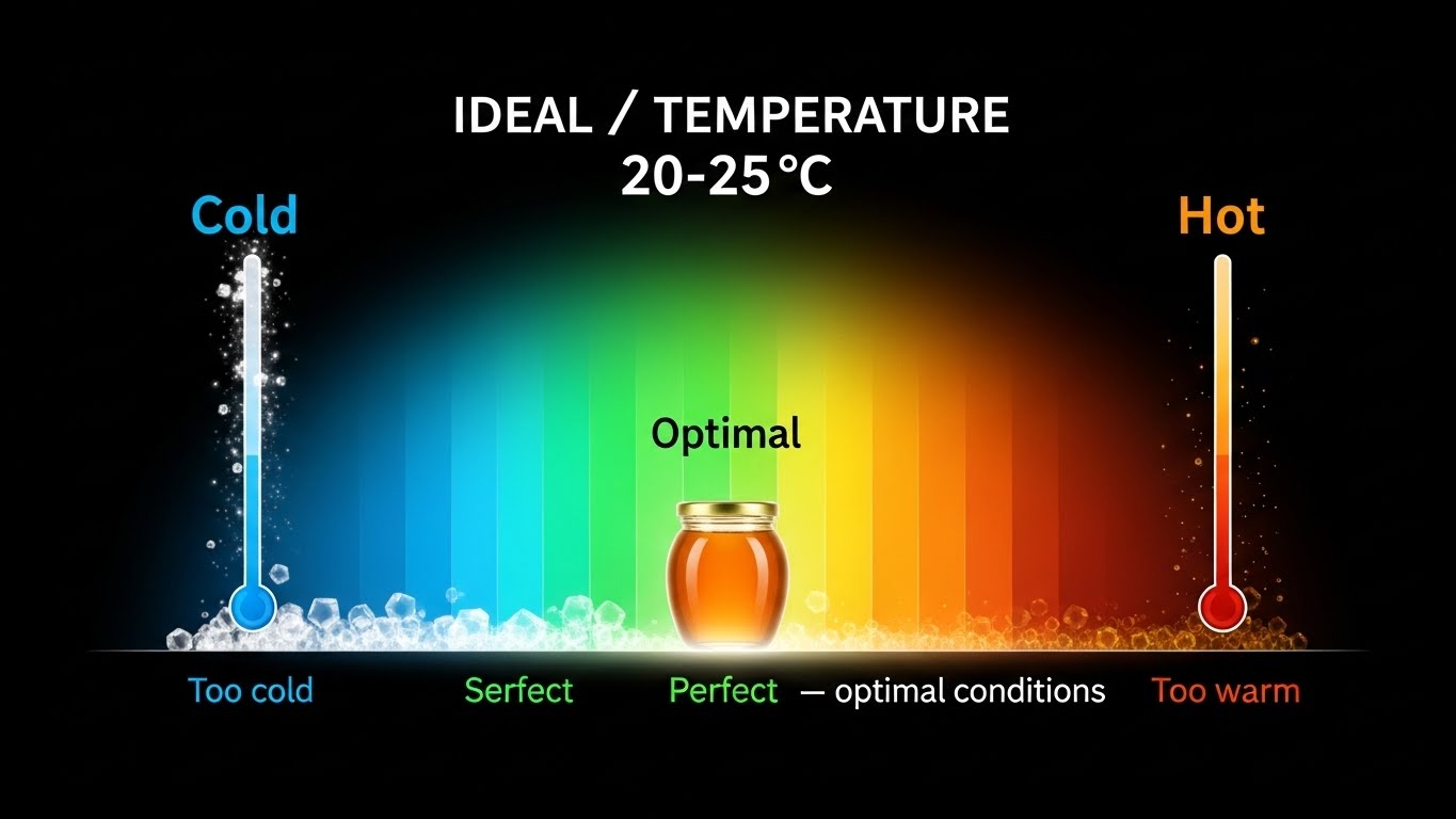꿀은 냉장고에 넣지 않고 상온에 보관하는 게 가장 좋아요. 이상적인 보관 온도는 10~25도 정도인데, 특히 20도 내외가 최고예요. 저는 주방 찬장에 꿀을 보관하는데 여기가 가장 좋은 환경이더라고요.