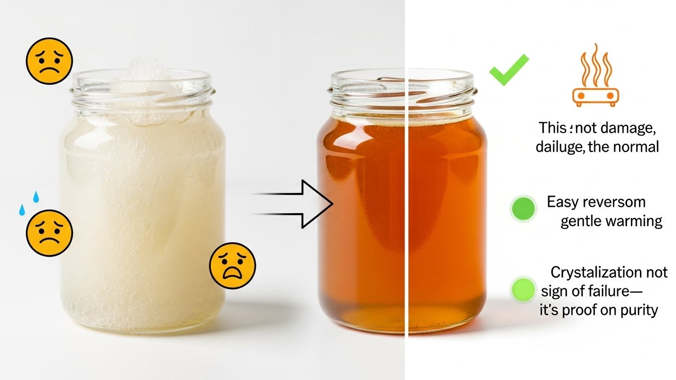유채꿀, 싸리꿀, 잡화꿀처럼 포도당 함량이 높은 꿀일수록 결정화가 쉽게 일어나요. 특히 12~14도의 저온에서 보관할 때 자주 생겨요. 이렇게 결정화된 꿀도 완벽하게 안전해서 그대로 먹어도 되고, 녹여서 먹어도 돼요.