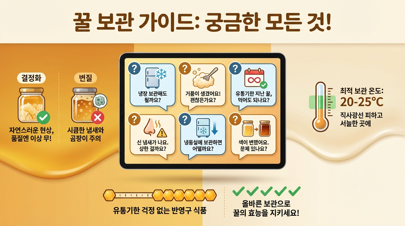 냉장고에 넣으면 꿀이 굳거나 결정화될 수 있어요. 이건 부패가 아니라 포도당 결정체가 생기는 현상이지만, 먹을 때 불편할 수 있으니까 상온 보관이 좋아요. 여름에도 냉동실에 안 넣고 실온에 두세요.