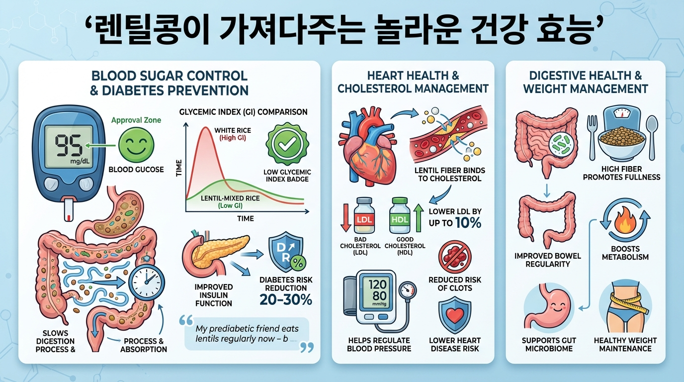 렌틸콩의 가장 주목할 만한 효능은 혈당 조절 능력이에요. 렌틸콩은 식이섬유가 풍부해서 음식이 소화되는 속도를 늦춰주고, 혈당이 천천히 올라가도록 도와줘요. 그래서 당뇨병 환자나 혈당 관리가 필요한 사람들에게 정말 좋은 음식이에요.